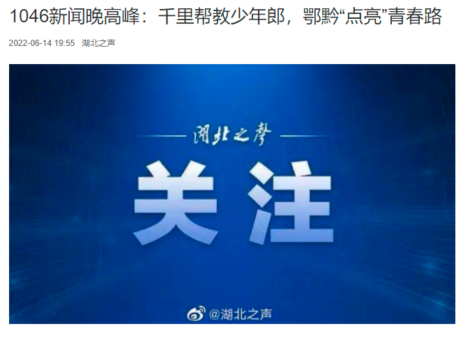 (通讯员 周雨琪)近日,《湖北之声》“1046新闻晚高峰”以《千里帮教少年郎,鄂黔“点亮”青春路》为题,对本院开展异地帮教工作,落实“教育、感化、挽救”方针和“教育为主、惩罚为辅”原则,坚持严格、规范、公正、文明司法,以专业化、规范化建设为抓手,进一步提高未成年人司法保护水平给予肯定。