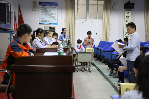 在樊城区检察院检察官的带领下,50余名小记者走进该院与市二十四中学共建的法制教育基地,参观了青少年法庭和法制长廊。随后,检察官拿出提前准备的模拟法庭剧本,帮助小记者们分配各自所要扮演的角色。庭审过程中,小记者们全心投入到各自角色中,检察官、法官、辩护人、被告人等各司其责,庭审取得了良好的效果。