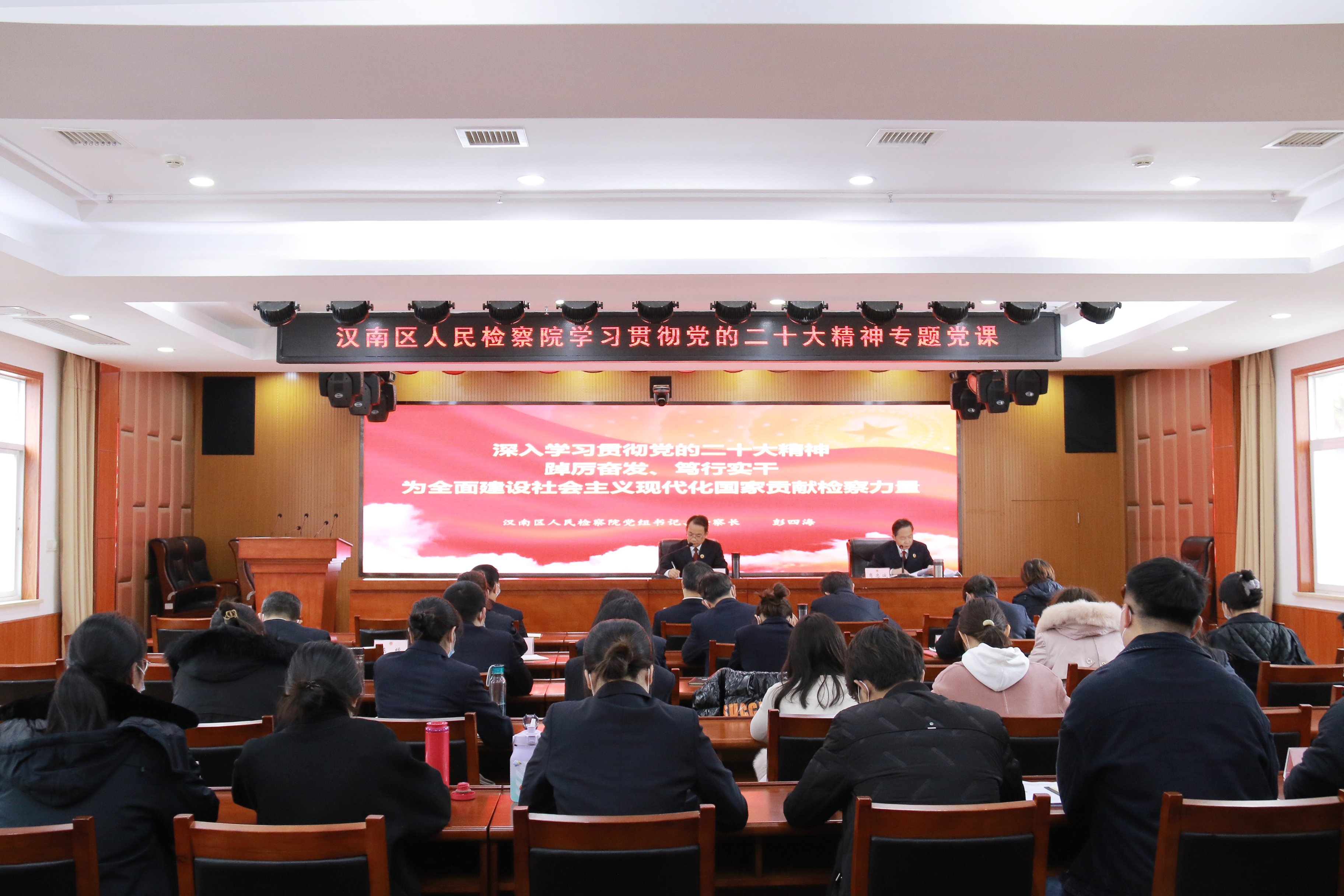 彭检指出,全体检察干警要把学习宣传贯彻党的二十大精神作为当前和今后一个时期的首要政治任务,各部门都要对照决策部署,紧密结合深化“质量建设年”,打破固化思维模式,进一步深入思考研究本部门、本条线明年和今后一个时期的工作目标、主要任务和重点举措,切实落实好习近平总书记要求的“心无旁骛,做好自己的事”!把党的二十大精神转化为工作的新动力、新思路、新举措,担当实干、争先跨越,推动汉南检察工作高质量发展。