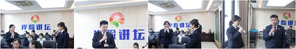 第四检察部负责人姚俊标听取了干警们的交流,他指出:党中央今年对检察机关做好公益诉讼提出了更高要求。公益诉讼工作接触的案件类型难度高、范围广,对青年干警的锻炼和成长很有帮助。希望青年干警参与到公益诉讼工作之中,合力推动本院公益诉讼工作再提升。