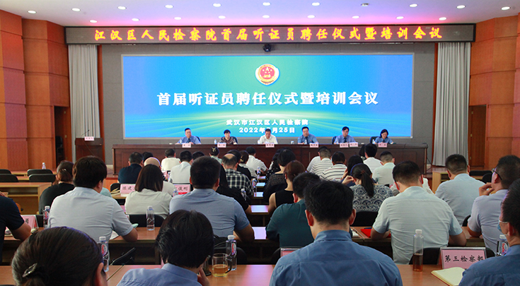 为推动检察听证工作全面深入开展,进一步提升检察工作的透明度和公信力,7月25日,江汉区人民检察院举行首届听证员聘任仪式暨培训会议,武汉市人民检察院党组副书记、副检察长陈重喜,案件管理办公室主任王琼莅临指导;江汉区院党组书记、检察长魏号国出席聘任仪式,部分院领导和各业务部门负责人、案件管理办公室干警参加仪式。