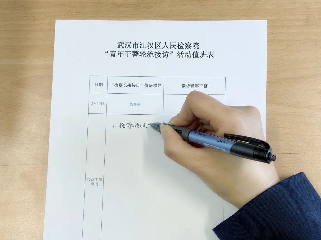 “近年通过公务员招录进院的青年干警,出校园进机关,较少有机会与群众直接接触。”据第五检察部主任乐峰介绍,“青年干警参加控申接访”活动由院领导决定开展,政治部与五部联合策划组织,旨在综合提升青年干警应急处突能力、群众工作能力和预防风险能力。轮训自今年3月23日起正式启动,每周三“检察长接待日”,当日值班领导所分管或协管的部门将指派两名青年干警参与辅助接访,逐步实现全院青年干警全覆盖。参训结束后必须填写值班表,详细总结接访工作事项交第五检察部存档。