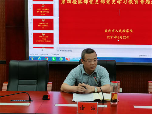 该院党组书记、检察长谢波以普通党员的身份参加会议,并就做好党史学习教育工作提出三点要求:一要在学深悟透上下功夫,推动党史学习走心出新。把习近平总书记“七一”重要讲话精神作为党史学习教育核心内容,深刻领会伟大建党精神,传承红色基因,把学习成效转化为推进检察工作发展的攻坚力量和前行动力。二要牢记党的宗旨使命,强化担当意识与为民情怀。检察干警要始终不忘自己党员、检察官身份,主动担当作为,一手抓疫情防控,一手抓检察工作,发挥职能筑牢抗疫法治防线,让检徽闪耀在战“疫”一线。三要坚定不移履职尽责,努力打造过硬检察队伍。坚定不移讲政治、坚定不移守纪律、坚定不移敢担当、坚定不移做奉献,严格贯彻执行“三个规定”,持续强化自身专业素养,提升履职能力。