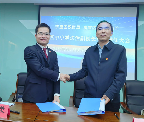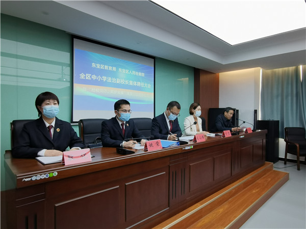 为进一步加大对未成年人的司法保护力度,织密未成年人保护伞,3月10日上午,东宝区检察院与该区教育局联合举行全区中小学法治副校长集体聘任大会暨“检校同行共护未来”关爱行动启动仪式,并对共同建立的《未成年人国家司法救助工作协作机制》进行了会签,10名校长现场为10名检察官颁发了法治副校长聘书。