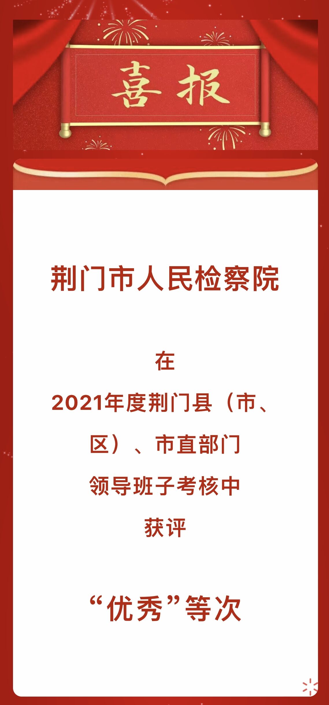 荆门市人民检察院在2021年度荆门县(市、区)、市直部门领导班子考核中获评“优秀”等次