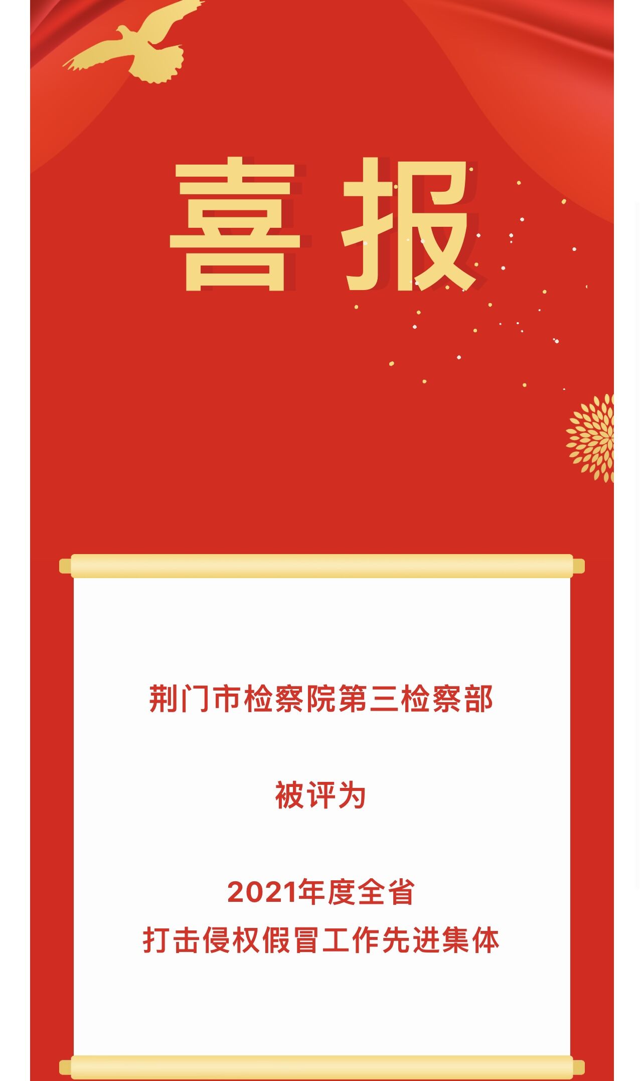 荆门市检察院第三检察部被评为2021年度全省打击侵权假冒工作先进集体