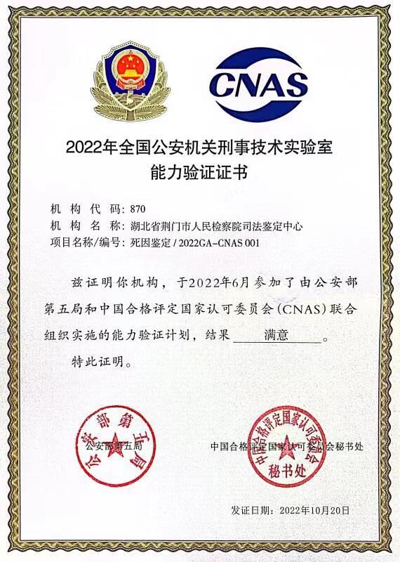荆门市检察院死因鉴定、伤情鉴定能力验证均获最高等级“满意”评价