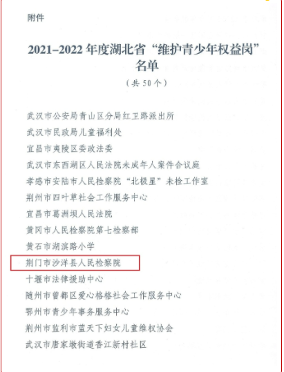 喜报!荆门市沙洋县检察院被命名为2021-2022年度湖北省“维护青少年权益岗”