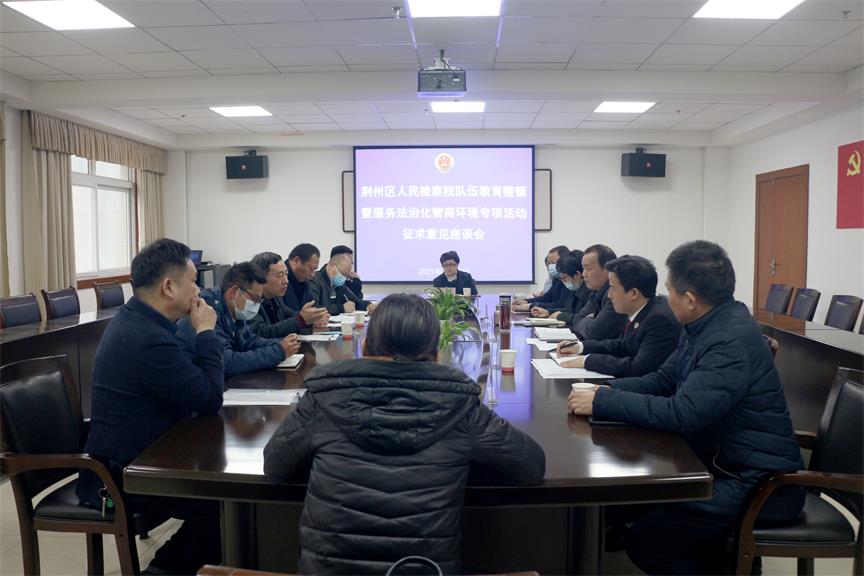 3月18日下午,荆州区人民检察院队伍教育整顿暨服务法治化营商环境专项活动征求意见座谈会在该院6楼会议室召开,院党组成员、副检察长龙时俊主持会议。他代表院党组对参会的人大代表、政协委员、企业家代表、律师以及人民监督员表示欢迎和衷心感谢。