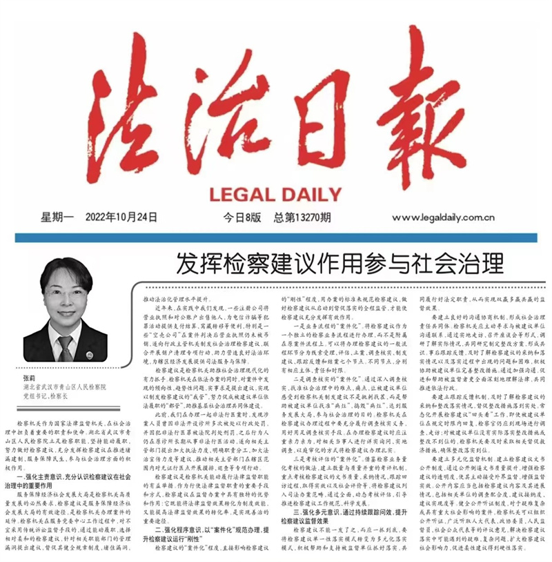 本网讯 (通讯员 张莉)检察机关作为国家法律监督机关,在社会治理中担负着重要的职责和使命。湖北省武汉市青山区人民检察院立足检察职能,坚持能动履职,努力做好检察建议,充分发挥检察建议在推进堵漏建制、服务保障民生、参与社会治理方面的积极作用。
