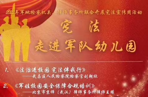 近日,在第九个国家宪法日来临之际,武昌区检察院联合武汉军事检察院、湖北省司法厅共同举办“宪法宣传周”普法活动。活动采取线上讲座形式开展,四家军队幼儿园170余名教职工通过视频会议参加。