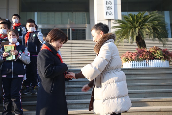 最后,育才汉口小学的同学们亲手给未检检察官和蒲公英姐姐们系上红领巾,致以少先队员的敬礼,庄严的检徽下红领巾迎风飘扬。