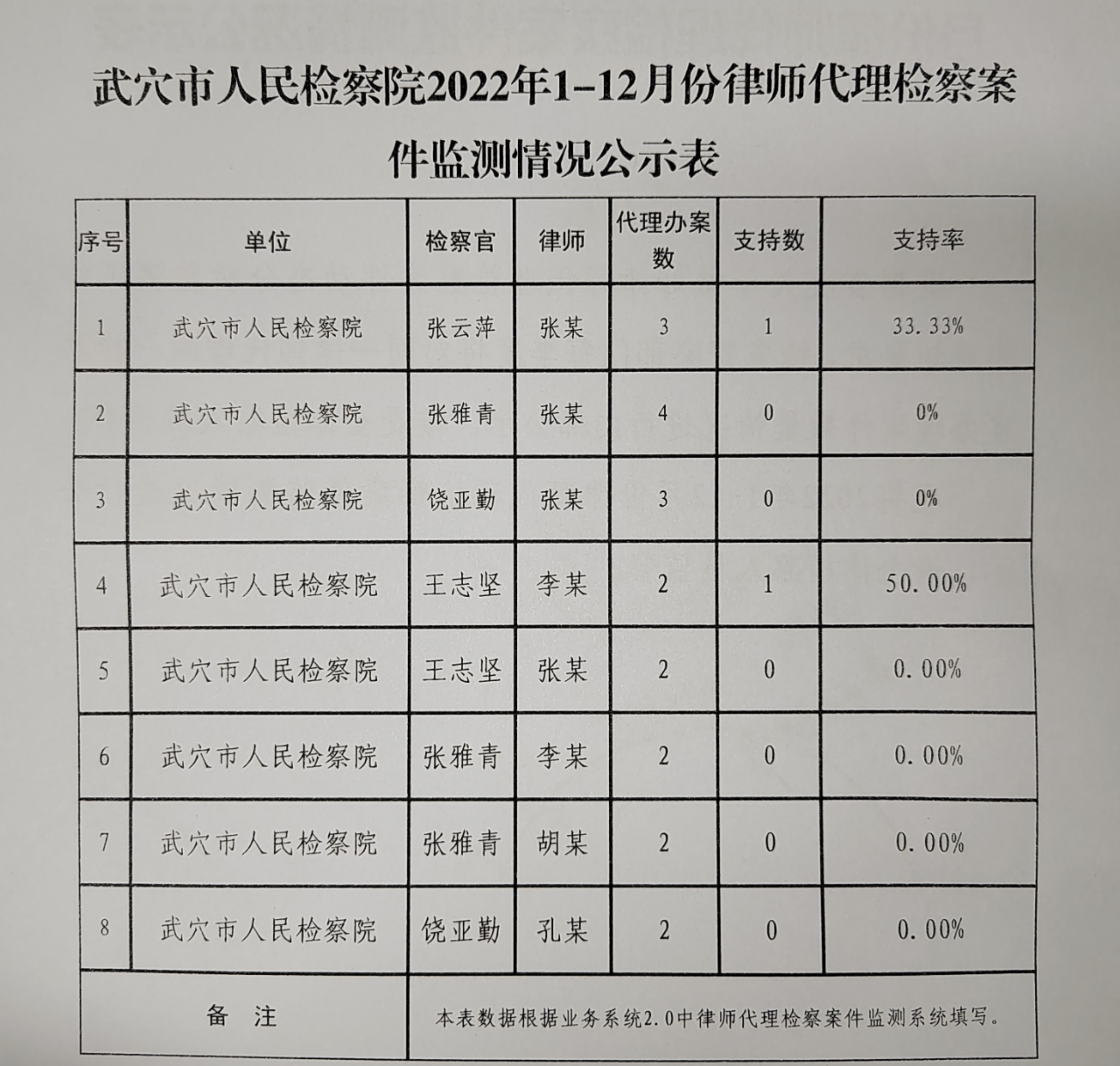武穴市人民检察院2022年1-12月份律师代理检察案件监测情况公示表
