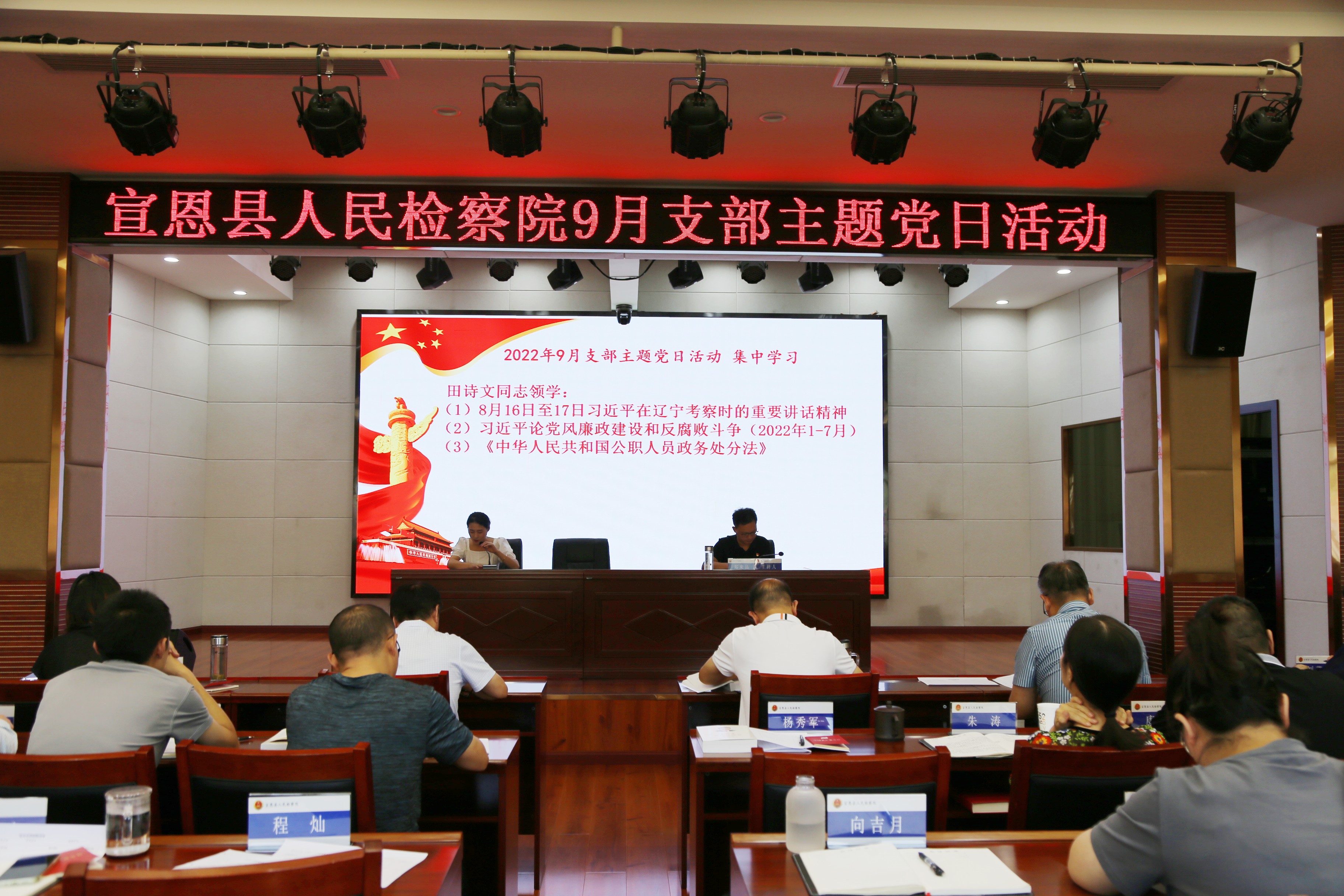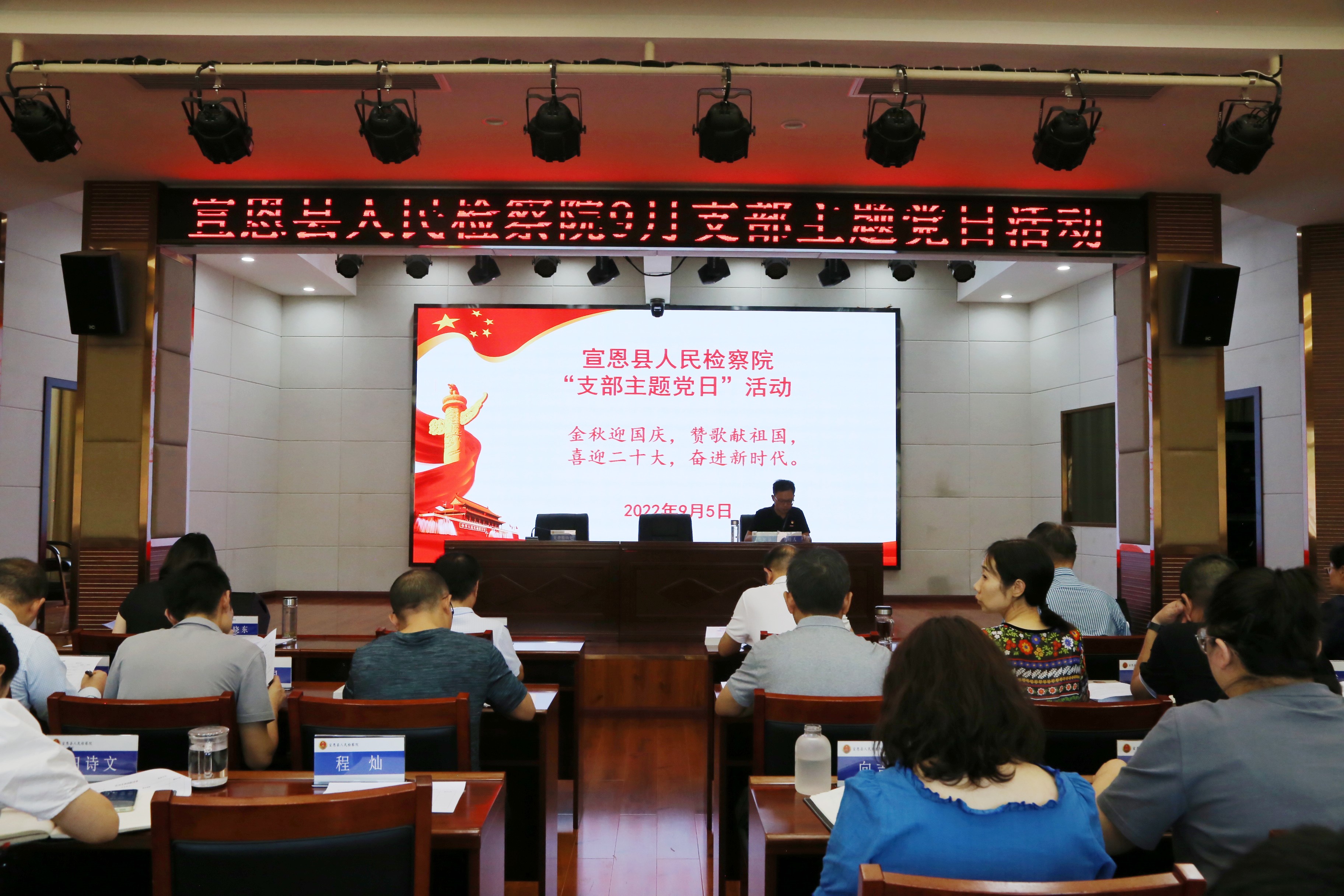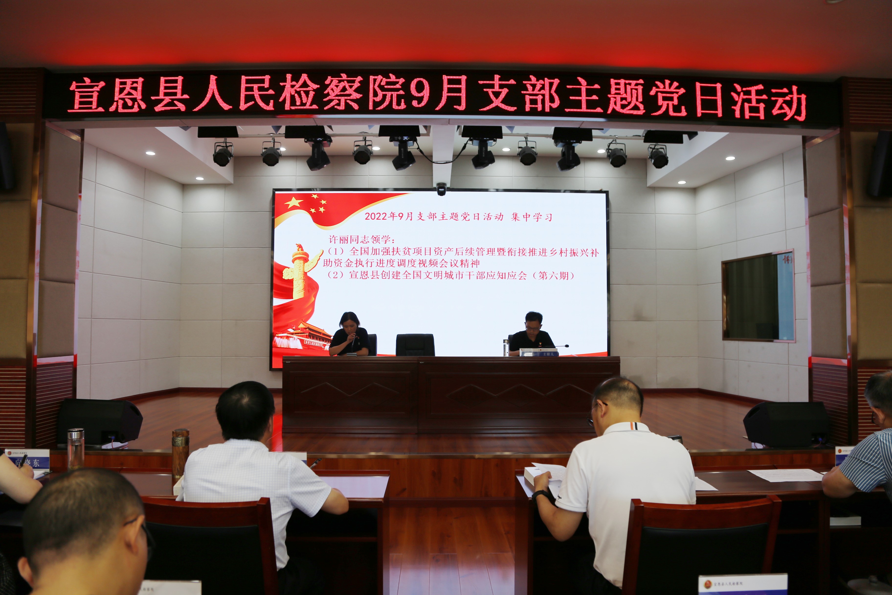 9月5日,宣恩县人民检察院开展了以“金秋迎国庆,赞歌献祖国,喜迎二十大,奋进新时代”为主题的9月支部主题党日活动。活动中,按照指导意见要求完成交纳党费、重温入党誓词、诵读党章、集中学习等内容。