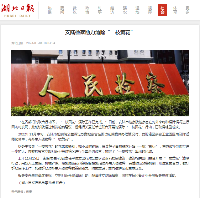 上年11月15日,该院依法向3家责任单位发出行政公益诉讼诉前检察建议,建议相关部门联合开展“一枝黄花”清除行动,采取人工拔除、机械铲除、喷施绿色药剂等综合措施治理外来入侵物种;完善防范预警机制,形成管控合力;做好群众宣传工作,加强群众对外来入侵物种的辨别能力、防控意识,共同维护全市生态安全。