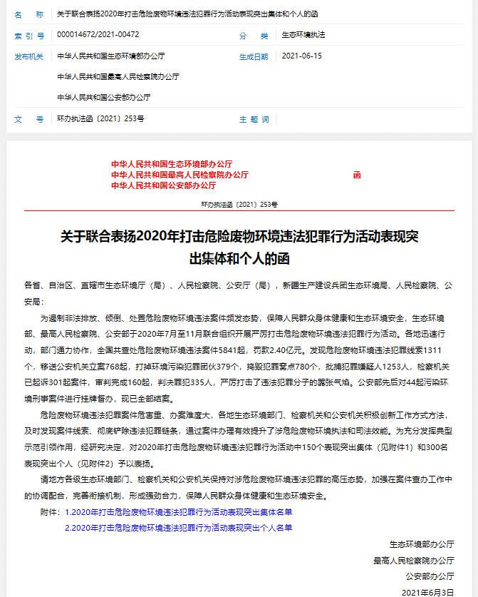 图为最高检、公安部、生态环境部联合表扬2020年打击危险废物环境违法犯罪行为活动表现突出集体和个人的函