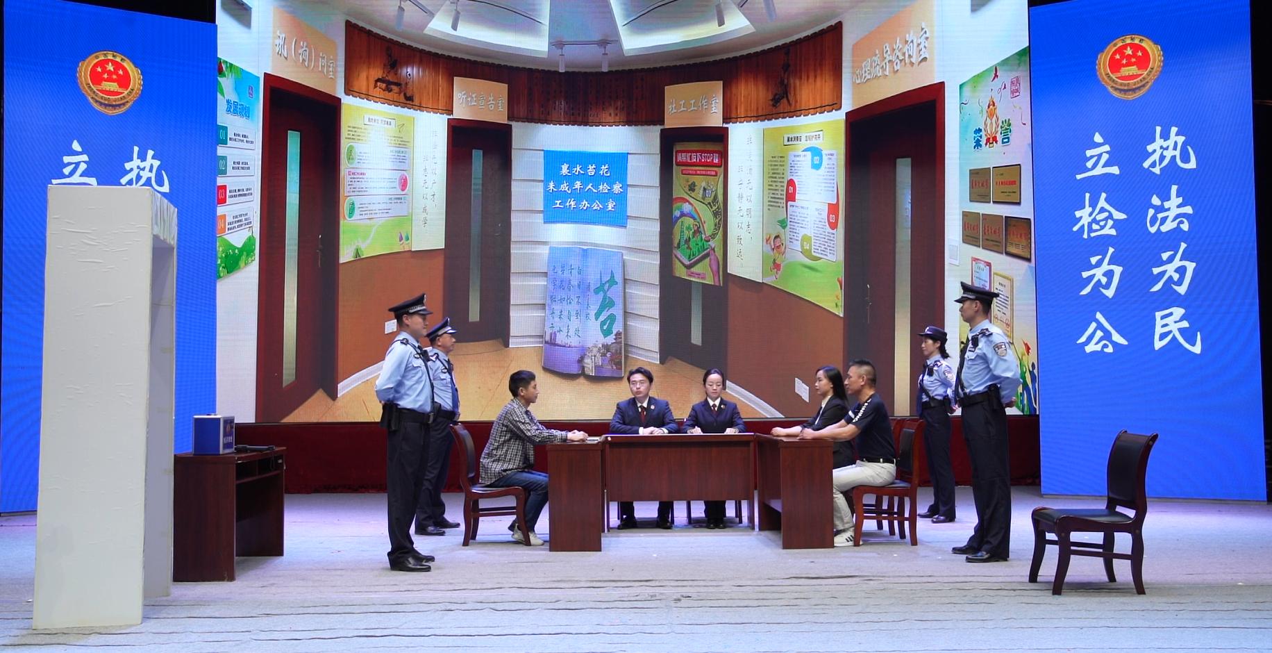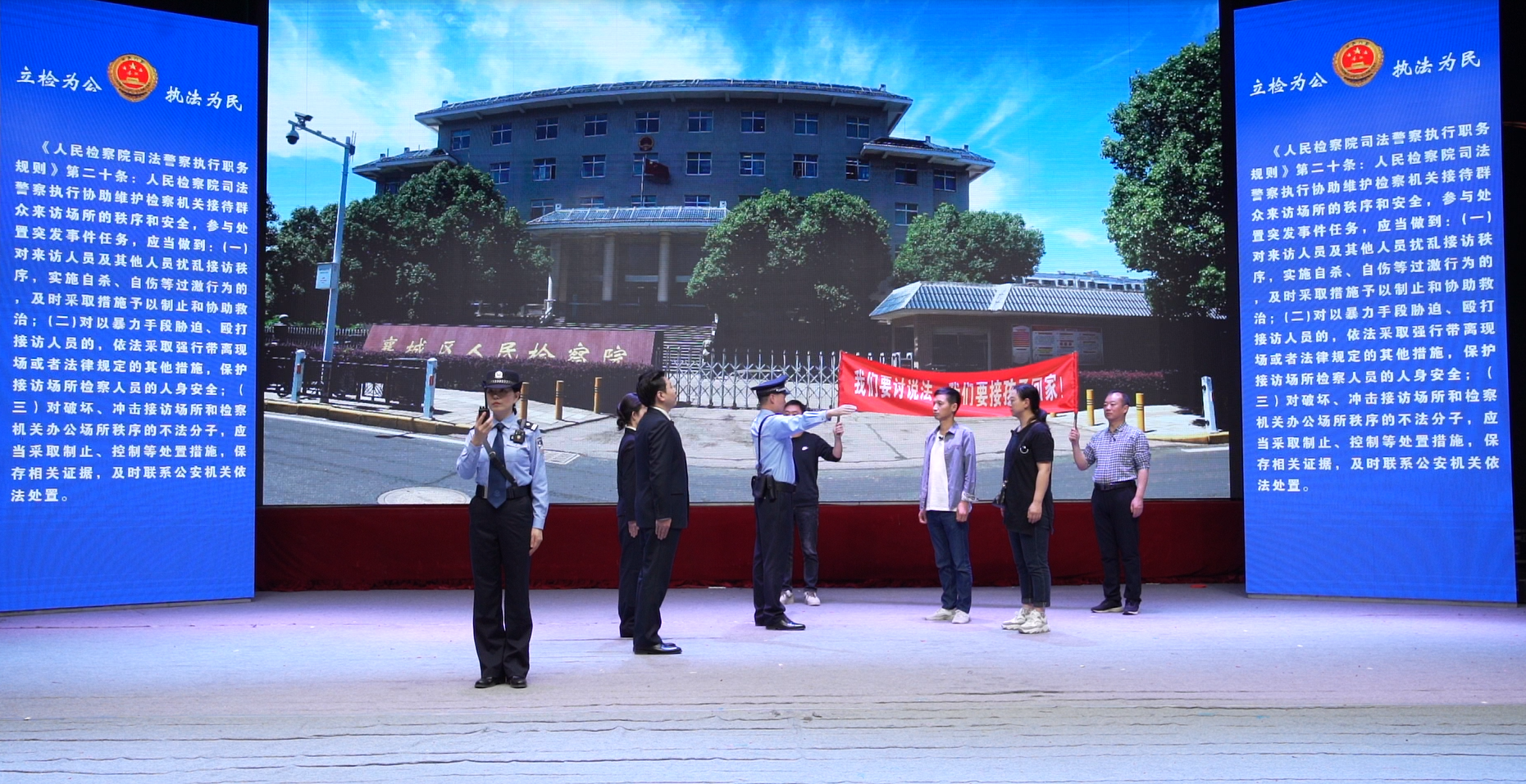 来自市县两级院共计17名法警,通过模拟演练的方式展现了在办案中法警如何依法派警、如何保障公益诉讼调查取证、当个案涉及警务保障环节较多时如何提供警务保障、在接待群众来访面对突发事件时司法警察如何依法履职、办案工作区秩序维护注意哪些问题、听证会上司法警察的履职创新如何拓宽等实际履职全貌。